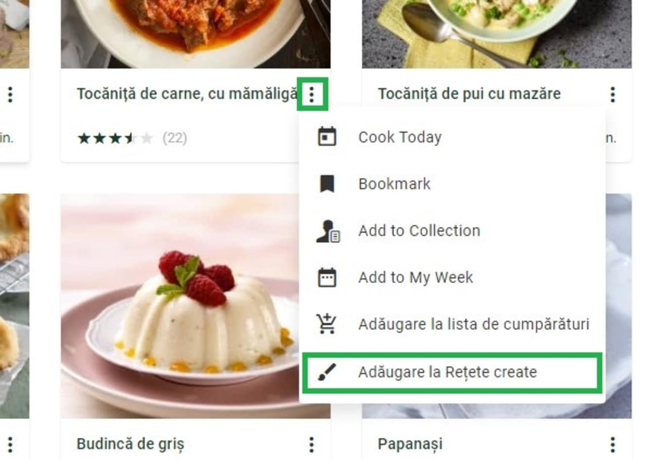 Faceți clic pe cele trei puncte din partea dreaptă jos a rețetei și selectați „Adăugare la Rețete create”. De aici, puteți ajusta ingredientele, cantitățile și etapele. Pentru a vă găsi rețetele mai târziu, deschideți „Rețetele mele” și faceți clic pe „Rețete create”.
