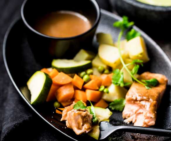 味噌奶油蒸鮭魚和海帶芽豆腐味噌湯