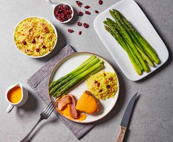 Menù: Filetto di manzo con contorno di asparagi, riso e salsa ai mirtilli rossi GIUSTA
