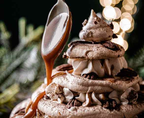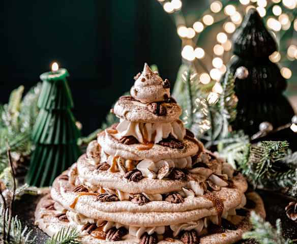 Pavlova au chocolat, caramel et noix de pécan en forme de sapin
