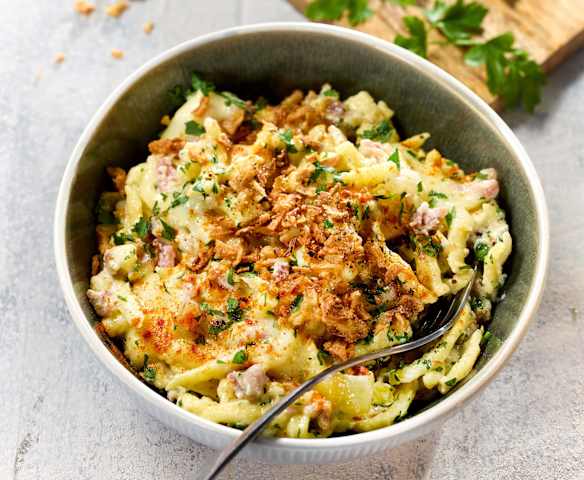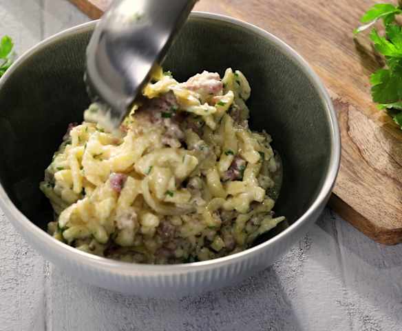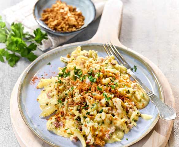 Möhren-Bratwurst-Spieße mit Kartoffeln und Zwiebelsauce