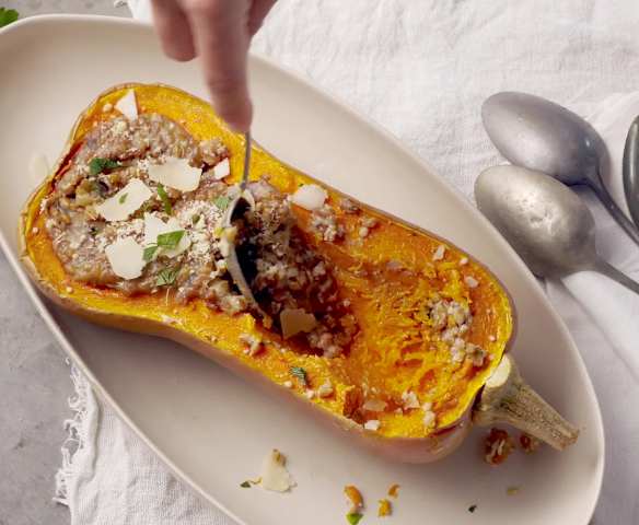 Abóbora recheada com espelta e cogumelos