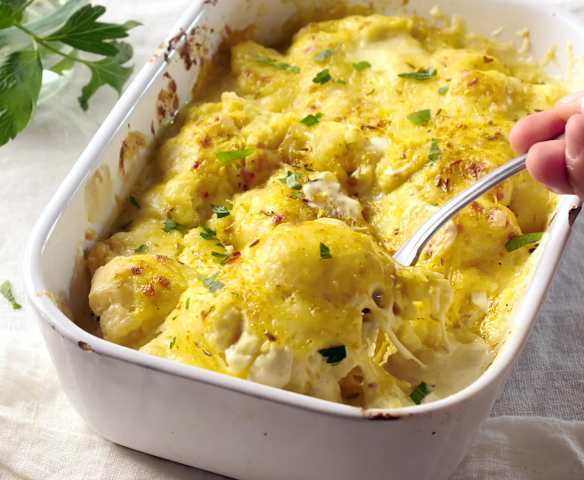 Gratinado de couve‑flor com caril e leite de coco